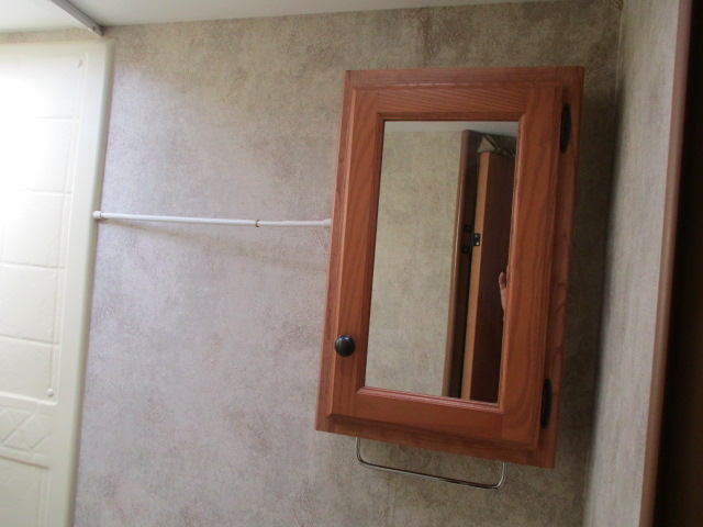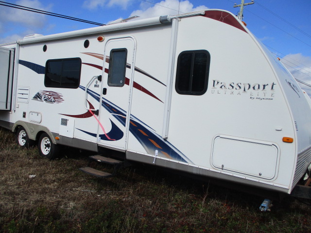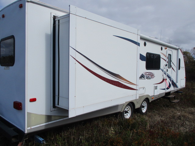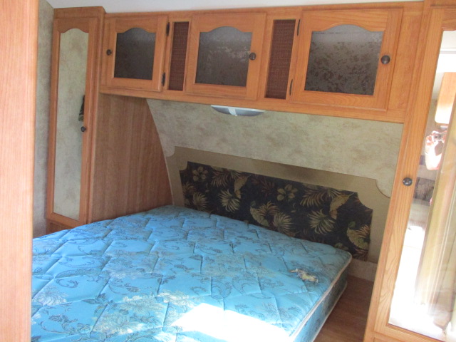 This trailer has a front queen bedroom , rear jack knife sofa w/ bunk overhead , slide w/ sink , stove , micro and jack knife sofa , rear side bath w/ skylight over the tub , 4 stab jacks . UVW 2549 kg