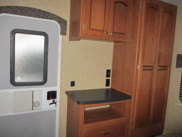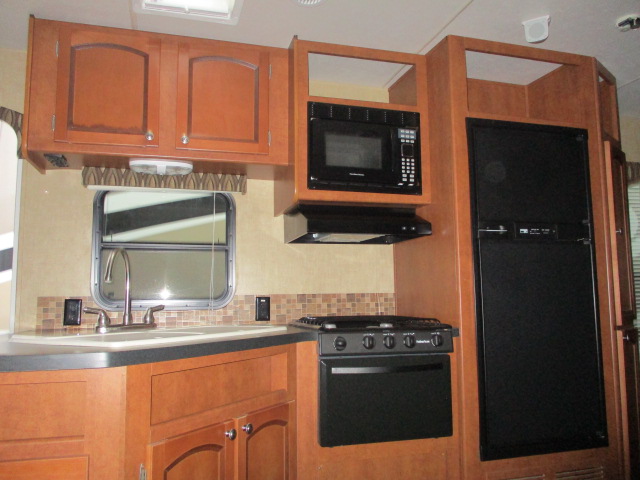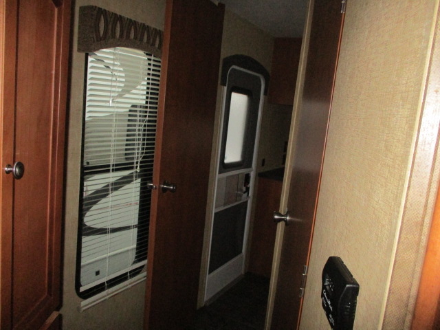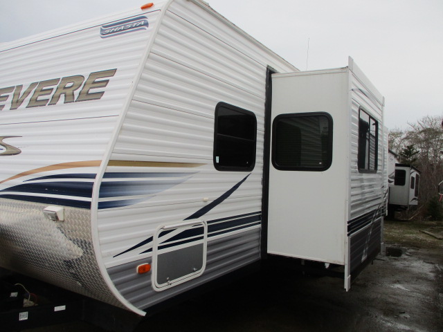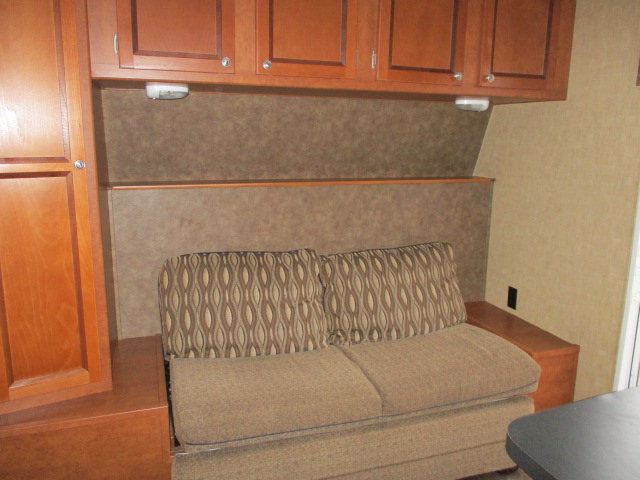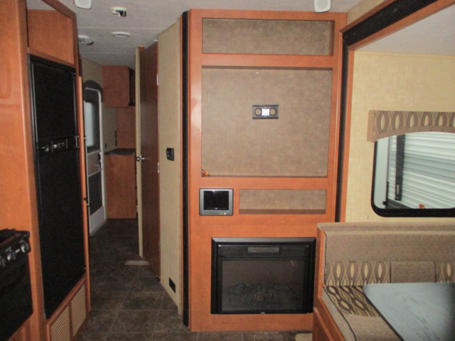 A two slide couple’s trailer with a front sofa , fold down dinette , rear queen bedroom w/ outside entrance door and a side bath w/ skylight over the shower. Other features: electric fireplace , AC . microwave , stereo , kitchen skylight , dbl sink , awning , outside shower , front pass thru storage. UVW 3156 kg