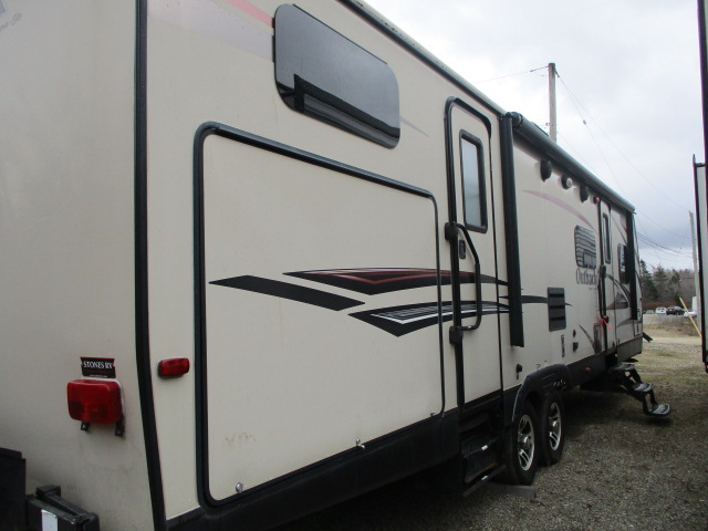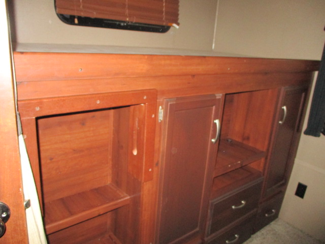 A two slide, two bedroom trailer with an outside kitchen , side bath w/outside entrance and skylight over the tub . Other features : ac , microwave , stereo , tv in front queen bedroom , rear mount spare tire , 4 stab jacks , power awning , aluminum wheels , swing-away barbecue mount, front pass thru storage . UVW 3529 kg