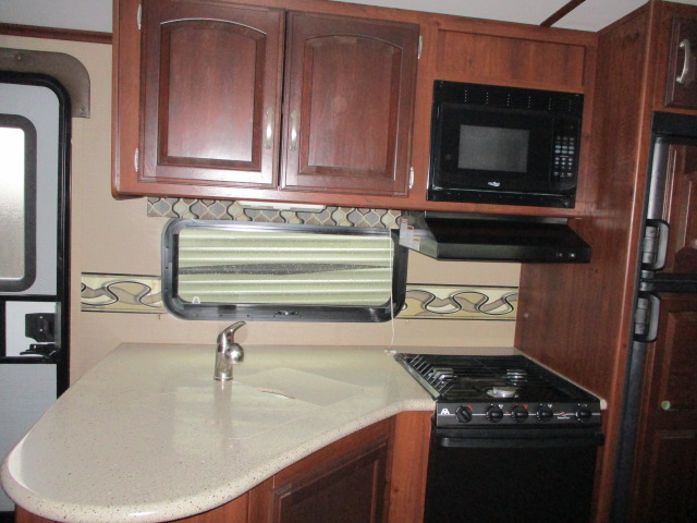 Kitchen: 3-burner stove, microwave, refrigerator, solid surface countertops