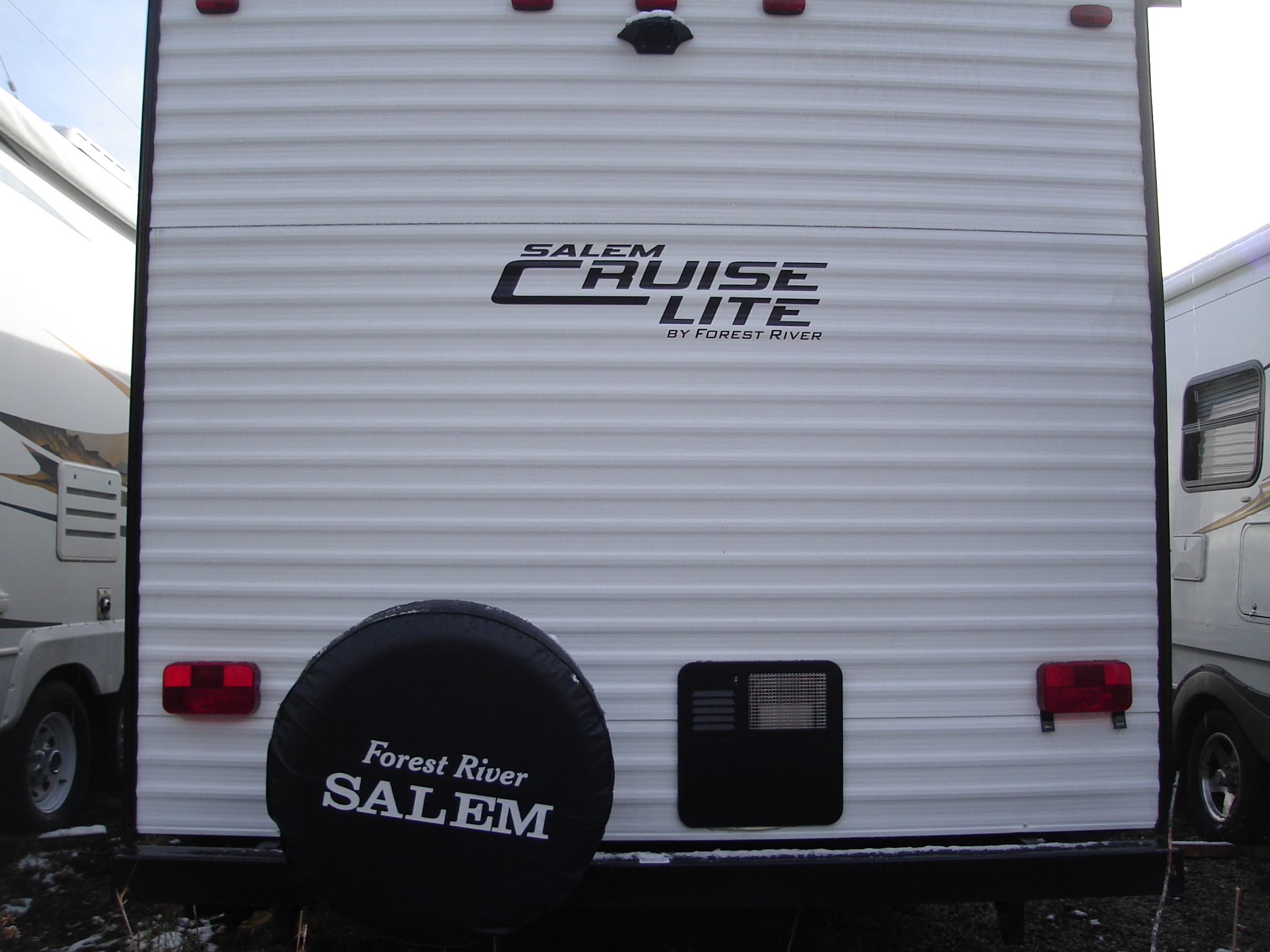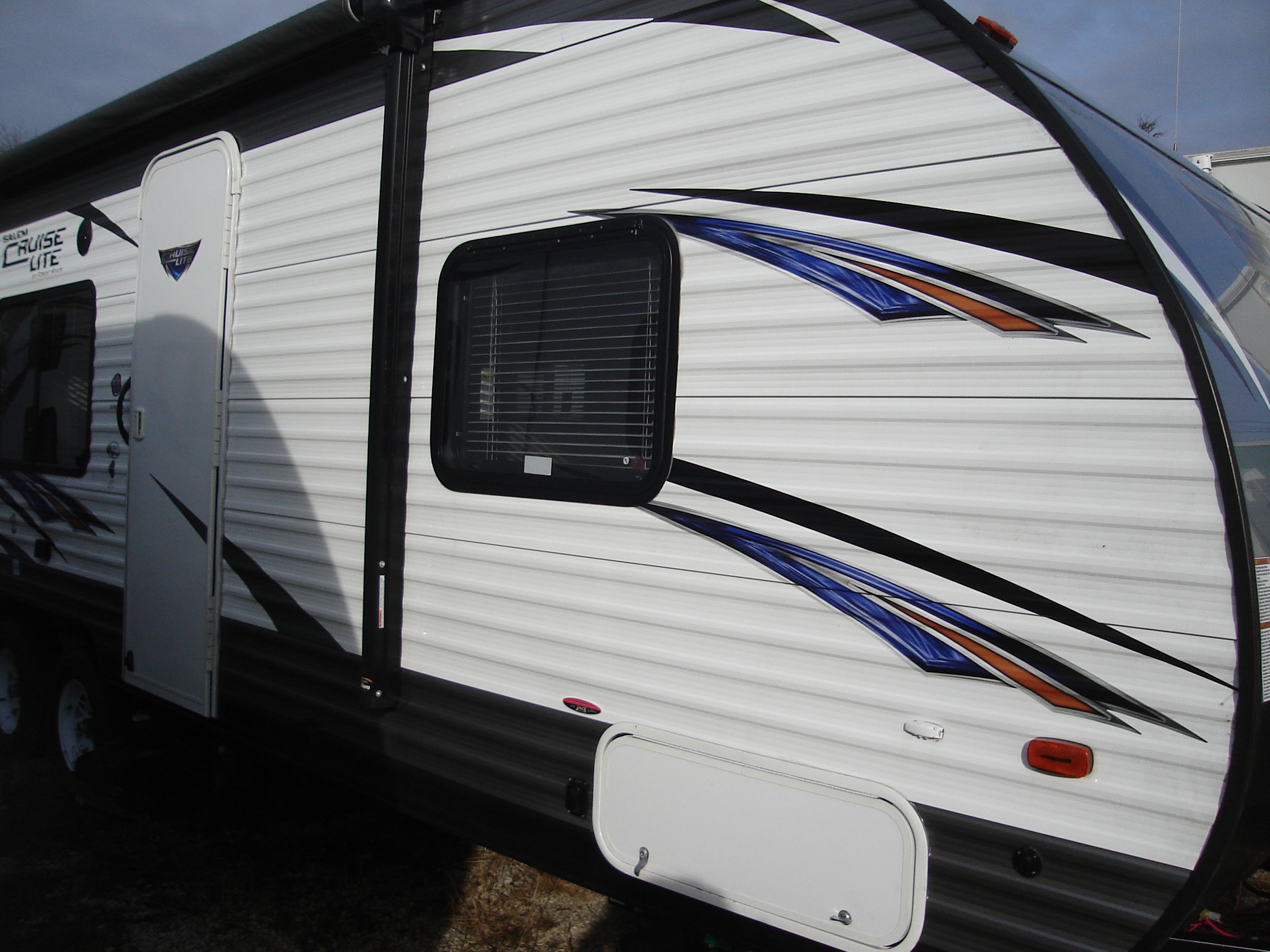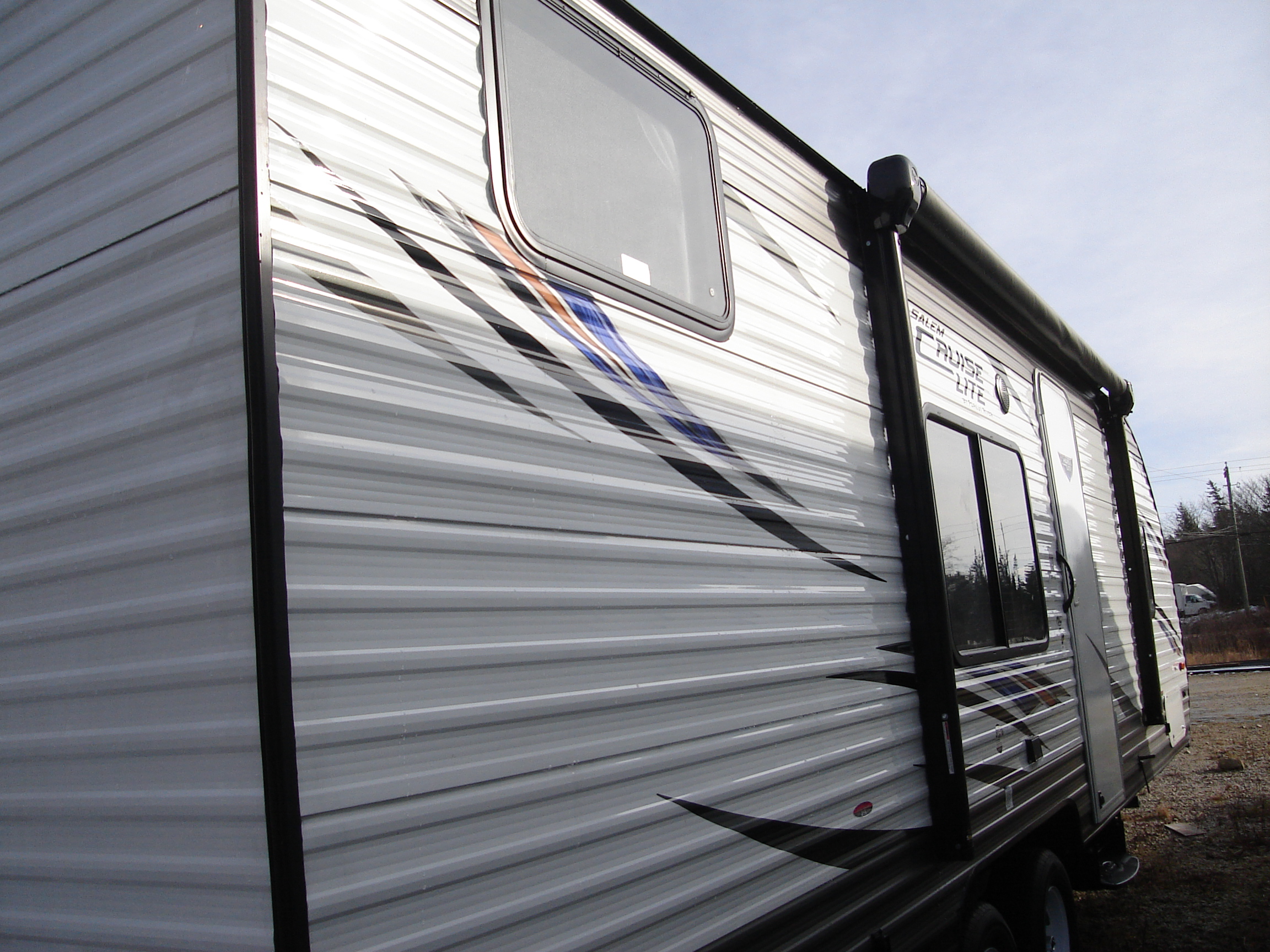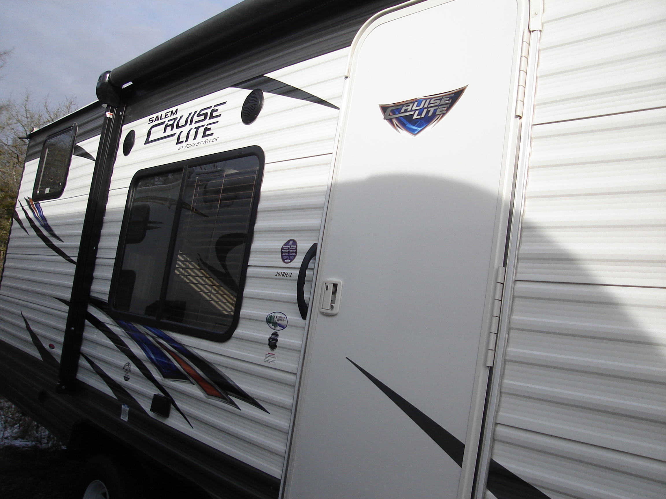 Exterior: Includes a power patio awning, power leveling jacks, and pass-through storage.