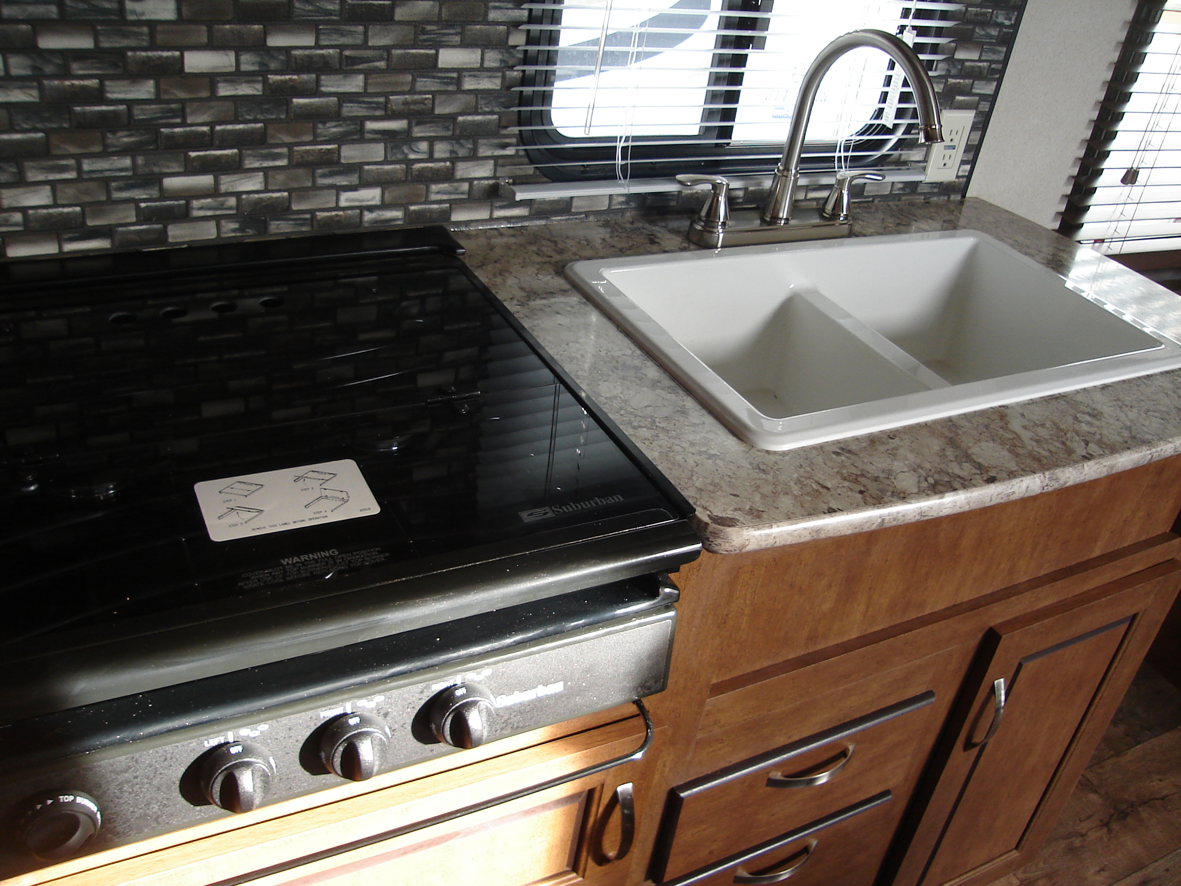 Kitchen: Includes an oven, microwave, and a two-way gas/electric refrigerator.