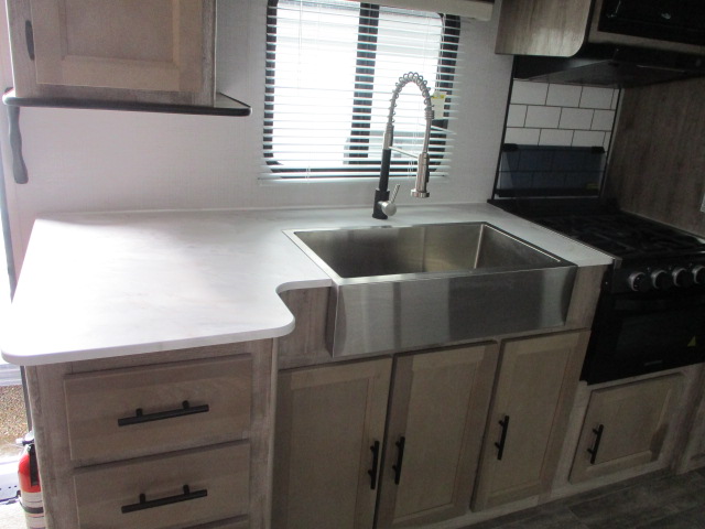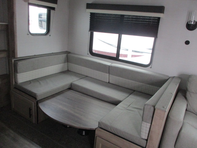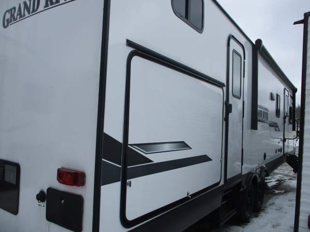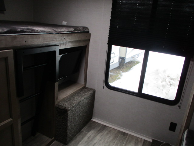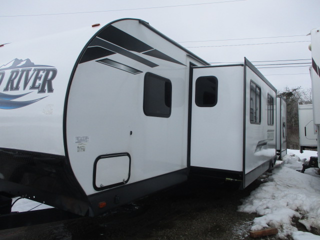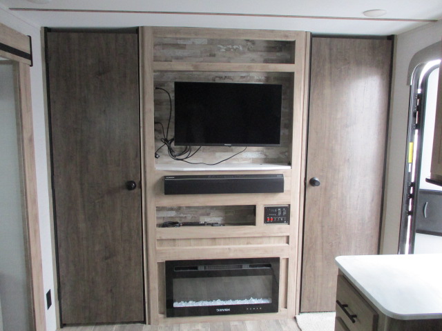 This family trailer has two slides , side bath w/ outside entrance , front queen bedroom , rear bunkroom and outside kitchen. Other features: AC , TV ,    micro , electric fireplace , Furrion sound bar w/ 2 outside speakers , LED interior lights , fibreglass exterior , power awning , power tongue jack , skylight over the tub , 4 stab jacks , outside shower , front pass thru storage . UVW 3659 kg