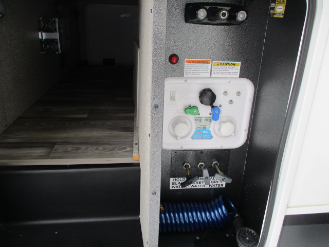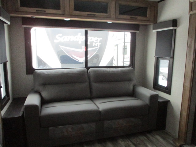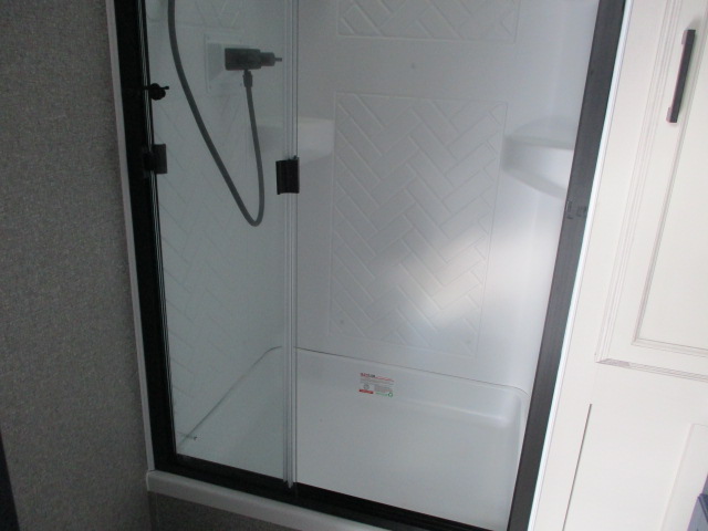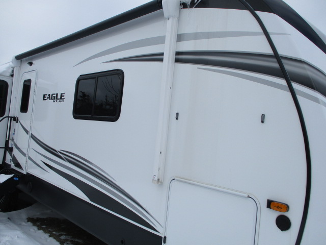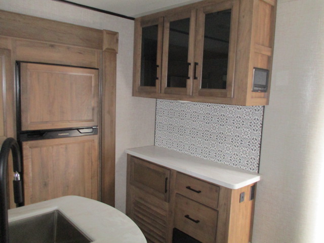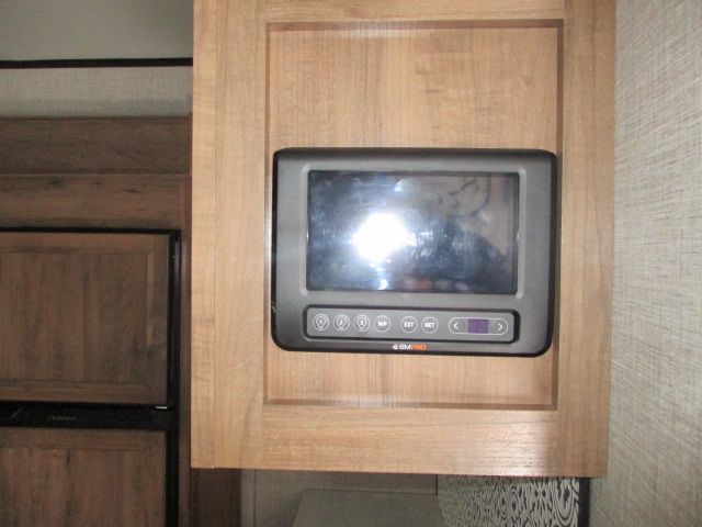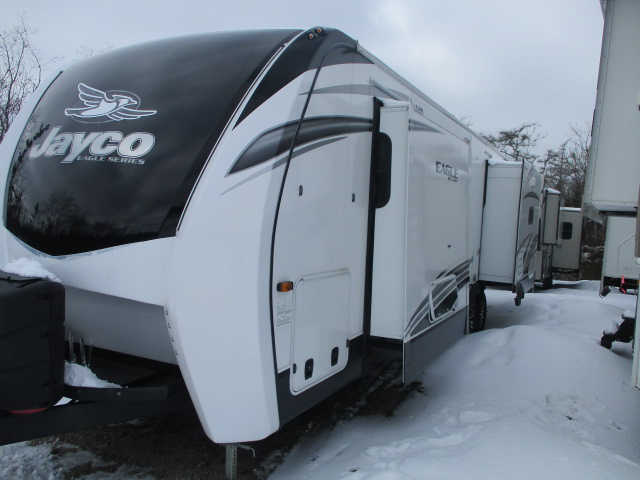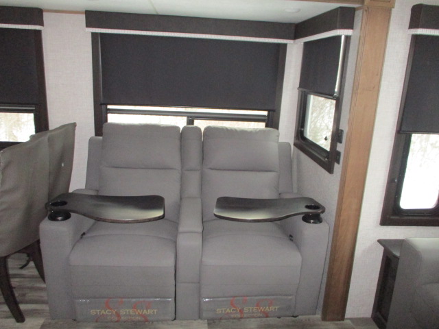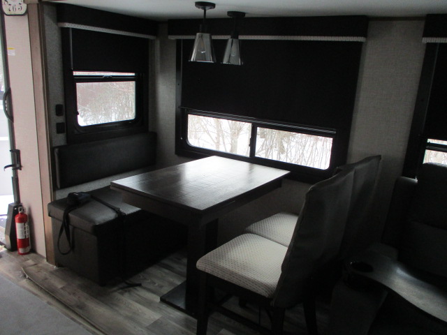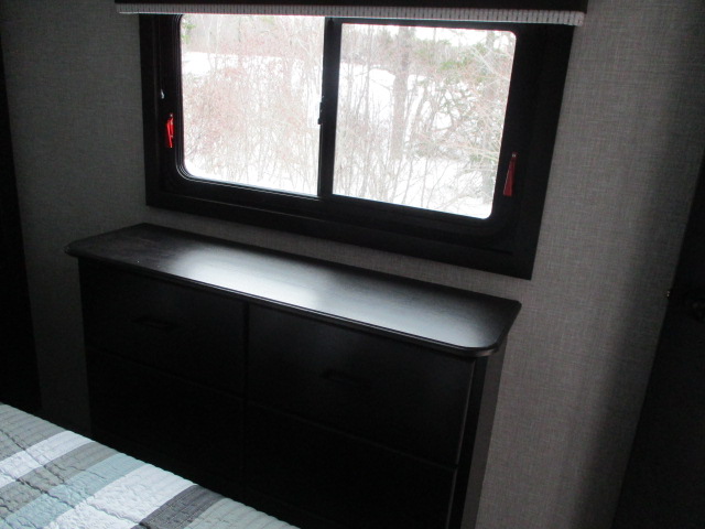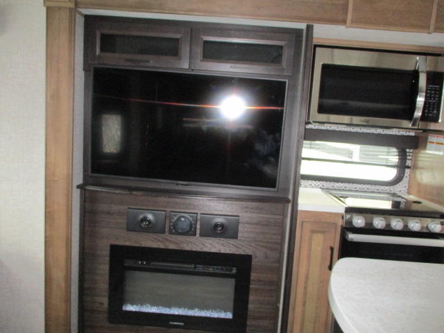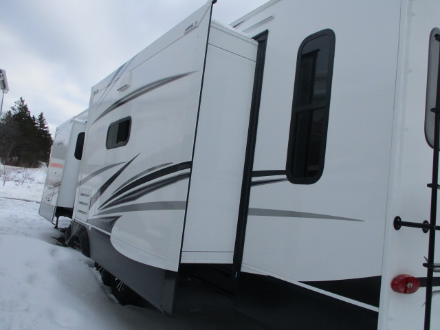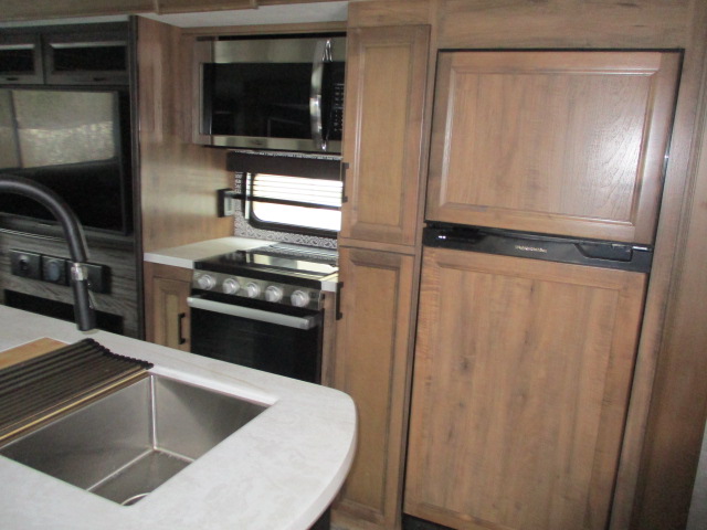 A three slide couple’s unit with lots of extras ! The front queen bedroom has a mirrored wardrobe and dresser , the living area has two theater seats,dinette , entertainment center and a kitchen island w/ stainless sink & storage and the side bath has a skylight over the shower. Other features: electric fireplace ,TV , rear trifold sofa , blackout roller shades , dual USB charging ports , power awning , real ladder , exterior shower , aluminum wheels , LP quick connect ,front pass thru storage , Jay Command Smart System . UVW 4186 kg
